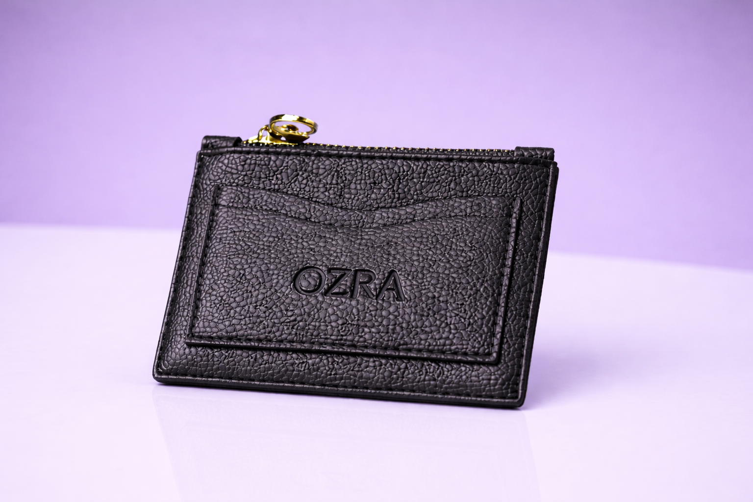 A sleek, compact cardholder crafted from premium textured leather, designed to keep your essentials organized without the bulk. It features multiple card slots and a secure zip pocket for cash or coins, making it perfect for everyday use or on-the-go convenience. Finished with refined stitching and subtle branding, it blends practicality with timeless style.